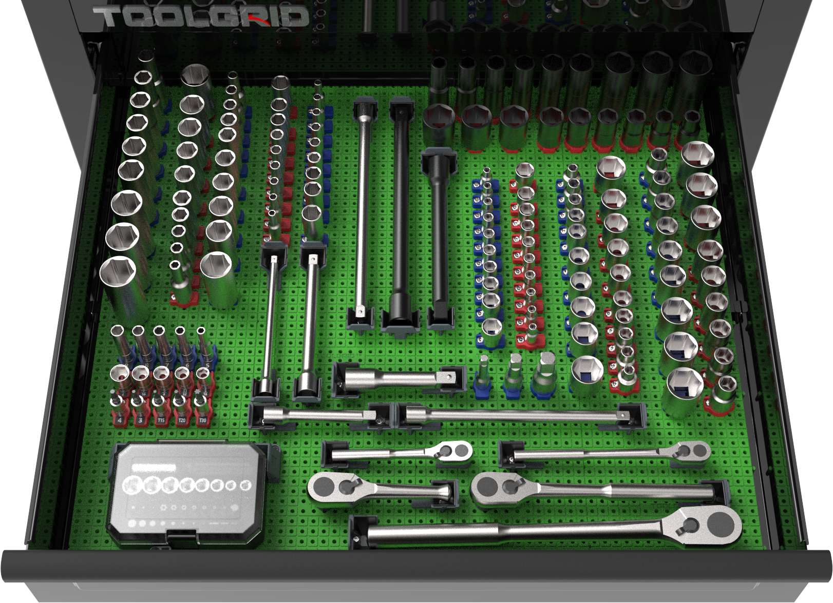 ツールグリッド™のモジュラー式ボードは、6インチ × 6インチ(153mm × 153mm)の正方形パネルを自由につなぎ合わせて使える便利な収納ツールです。