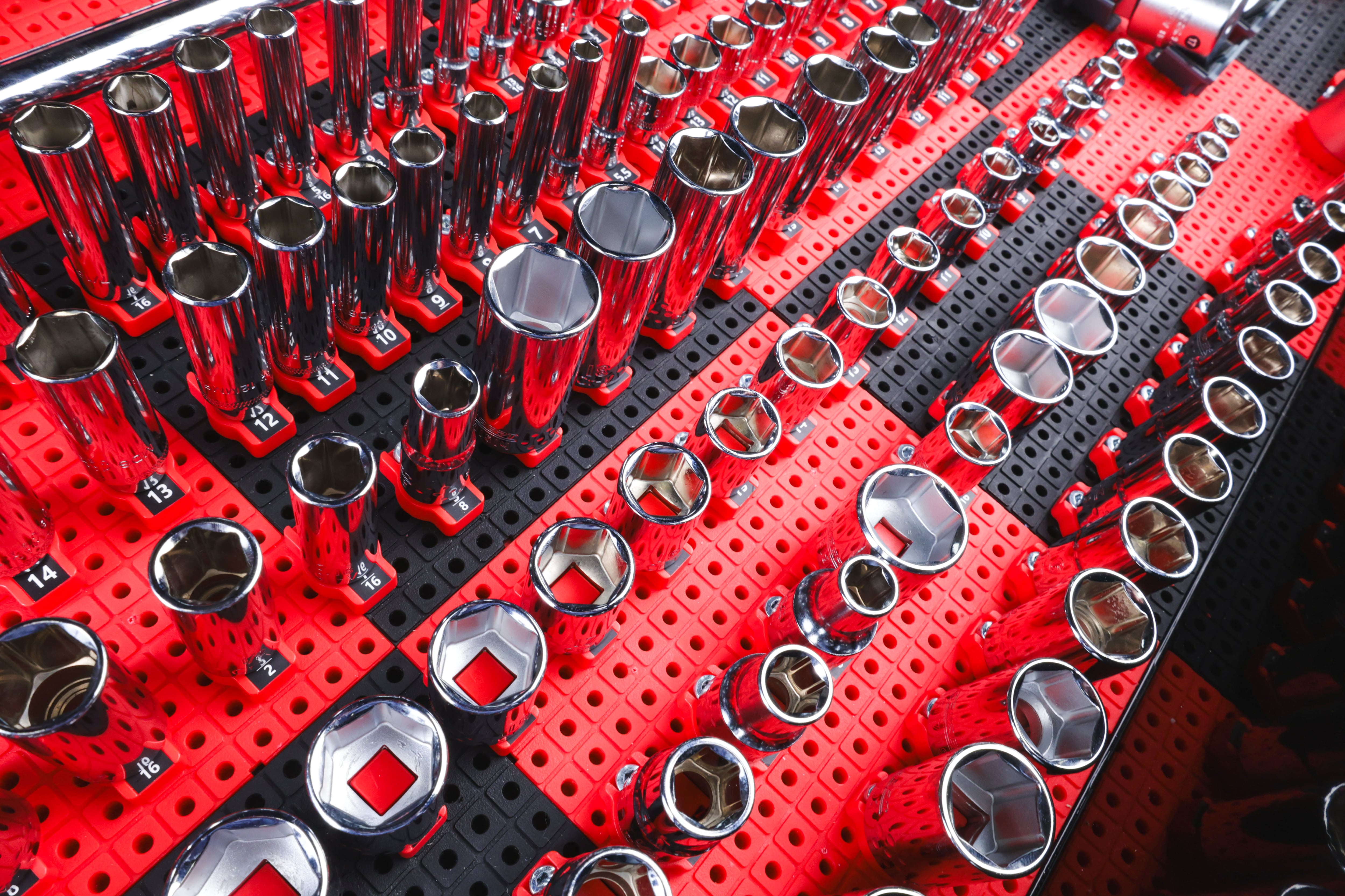 3/4インチ差込角ソケットをすっきり整理できる専用ホルダーで工具のずれ落ちを防ぎます。